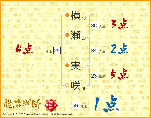 横(16画)瀬(20画) 実(14画)咲(9画)