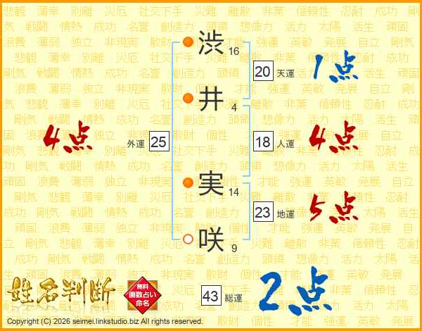 渋(16画)井(4画) 実(14画)咲(9画)