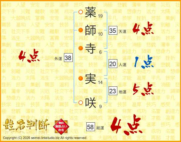薬(19画)師(10画)寺(6画) 実(14画)咲(9画)