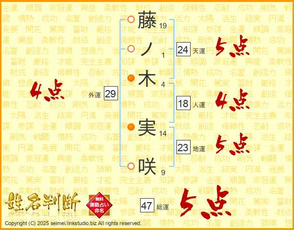 藤(19画)ノ(1画)木(4画) 実(14画)咲(9画)