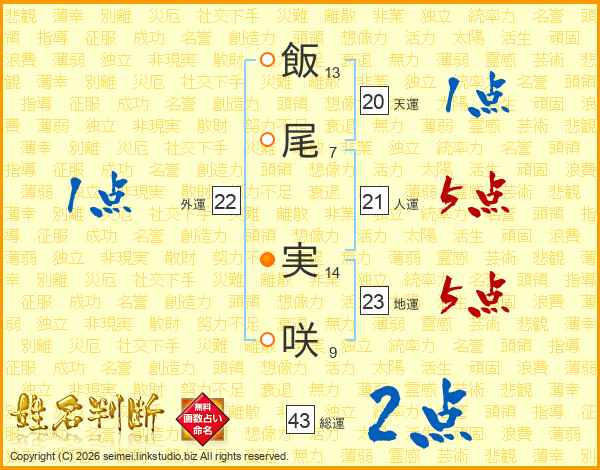 飯(13画)尾(7画) 実(14画)咲(9画)