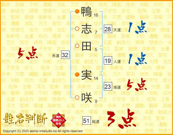 鴨(16画)志(7画)田(5画) 実(14画)咲(9画)