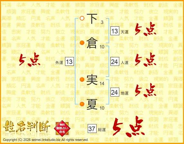下倉実夏さんの総運は37画の5点!
