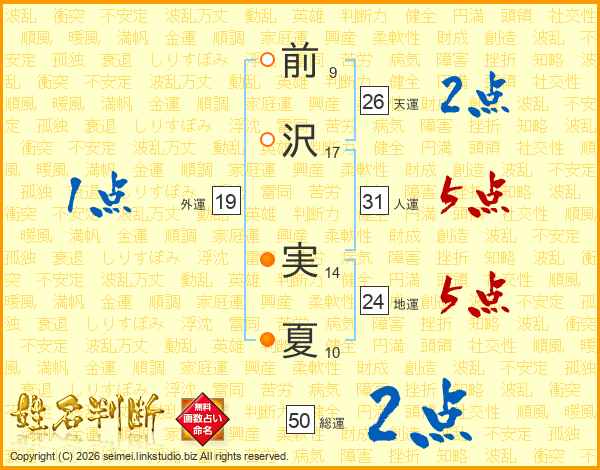 生活面を象徴する運勢です。外部から受ける影響力を表し、結婚運、家庭運や職場、環境への順応性を表します。総運から人運を引いた画数。姓や名が1文字の場合を除く。