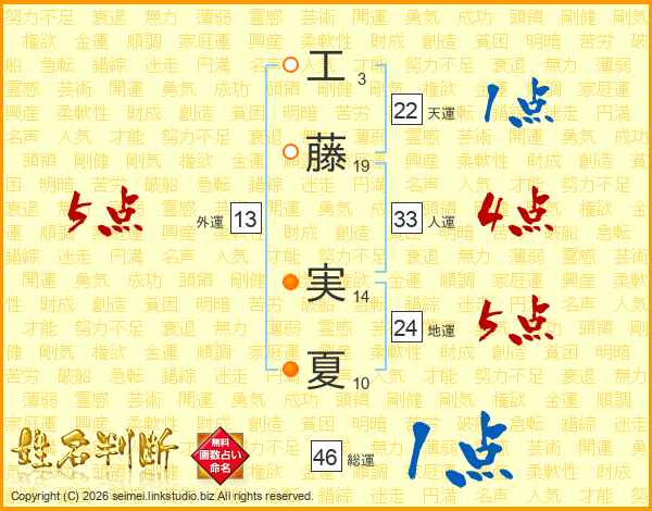 生活面を象徴する運勢です。外部から受ける影響力を表し、結婚運、家庭運や職場、環境への順応性を表します。総運から人運を引いた画数。姓や名が1文字の場合を除く。