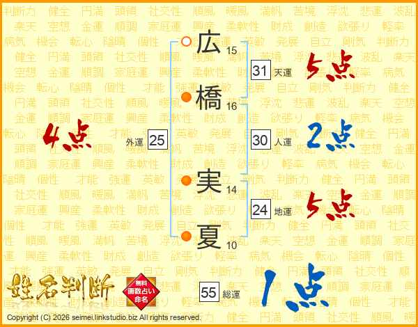 広(15画)橋(16画) 実(14画)夏(10画)