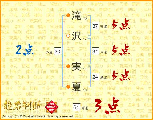 滝(20画)沢(17画) 実(14画)夏(10画)