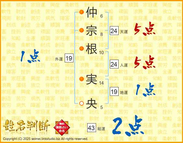 仲(6画)宗(8画)根(10画) 実(14画)央(5画)