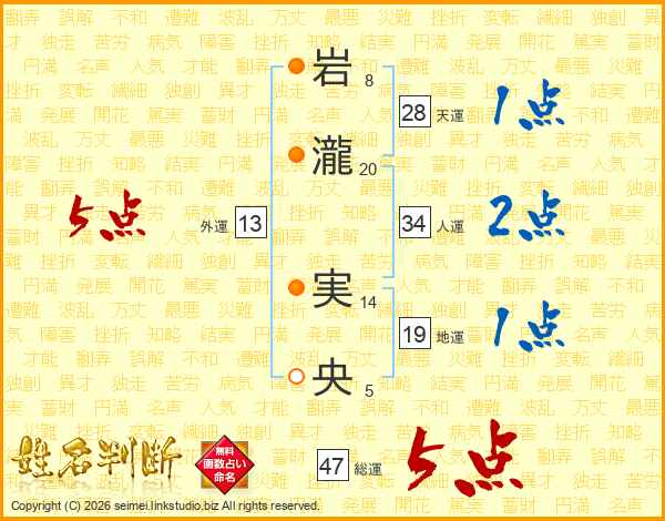 岩(8画)瀧(20画) 実(14画)央(5画)