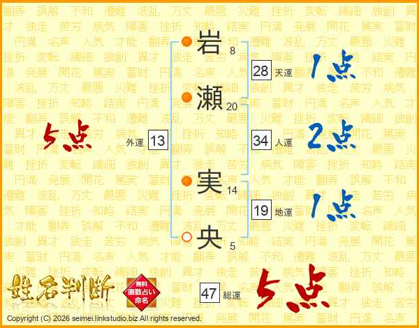 岩(8画)瀬(20画) 実(14画)央(5画)