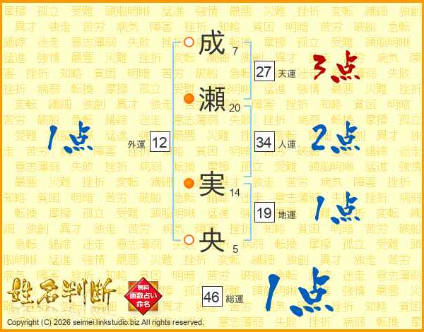 成(7画)瀬(20画) 実(14画)央(5画)