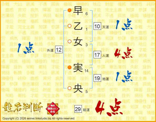 早(6画)乙(1画)女(3画) 実(14画)央(5画)
