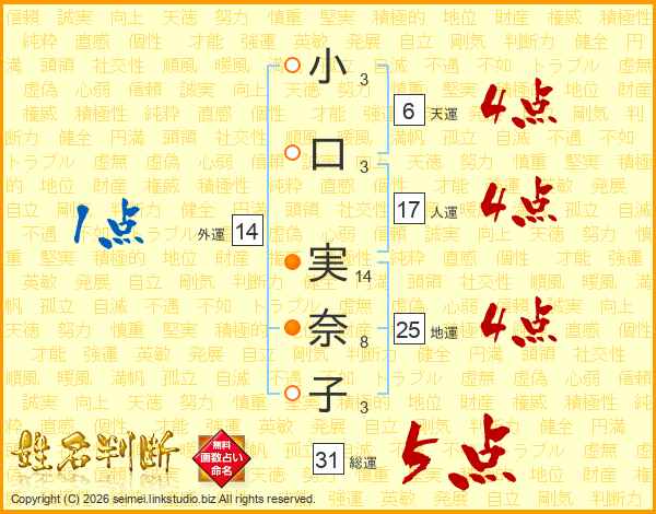 小口実奈子さんの総運は31画の5点!
