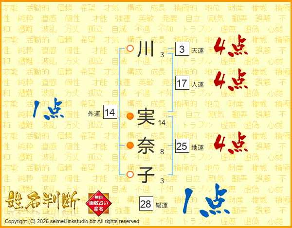 生活面を象徴する運勢です。外部から受ける影響力を表し、結婚運、家庭運や職場、環境への順応性を表します。総運から人運を引いた画数。姓や名が1文字の場合を除く。