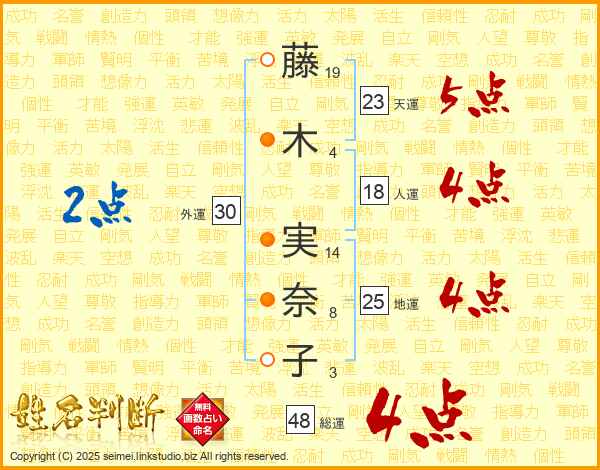 藤(19画)木(4画) 実(14画)奈(8画)子(3画)