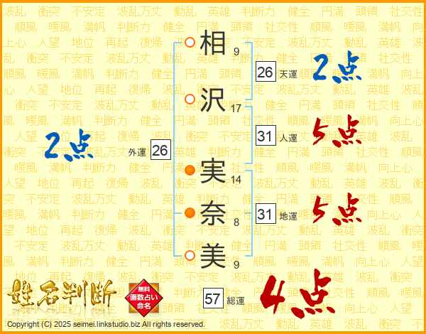 相(9画)沢(17画) 実(14画)奈(8画)美(9画)