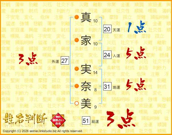 真(10画)家(10画) 実(14画)奈(8画)美(9画)