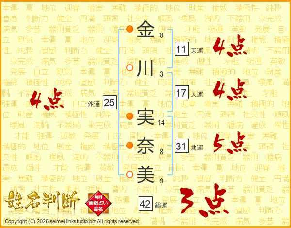 金(8画)川(3画) 実(14画)奈(8画)美(9画)