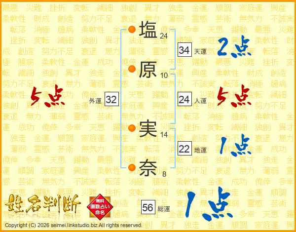 塩(24画)原(10画) 実(14画)奈(8画)