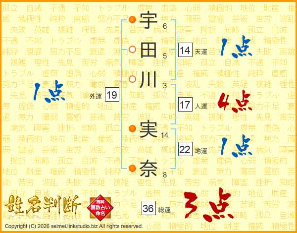 宇(6画)田(5画)川(3画) 実(14画)奈(8画)