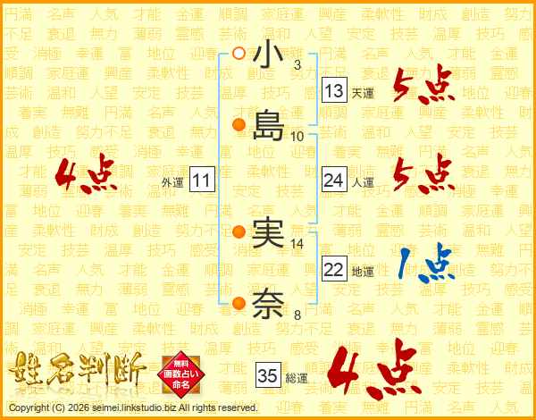 生活面を象徴する運勢です。外部から受ける影響力を表し、結婚運、家庭運や職場、環境への順応性を表します。総運から人運を引いた画数。姓や名が1文字の場合を除く。