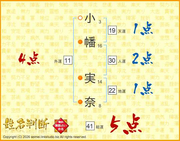 小(3画)幡(16画) 実(14画)奈(8画)