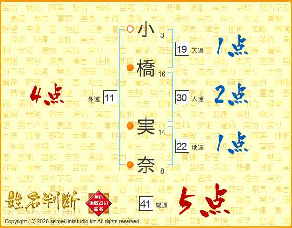 生活面を象徴する運勢です。外部から受ける影響力を表し、結婚運、家庭運や職場、環境への順応性を表します。総運から人運を引いた画数。姓や名が1文字の場合を除く。