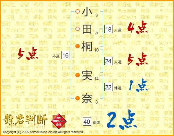 小(3画)田(5画)桐(10画) 実(14画)奈(8画)