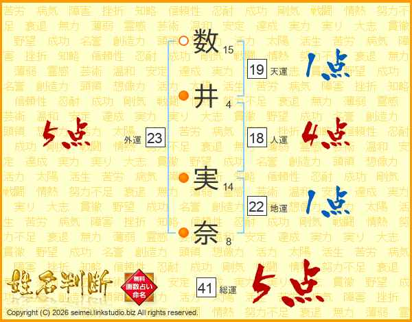 数(15画)井(4画) 実(14画)奈(8画)