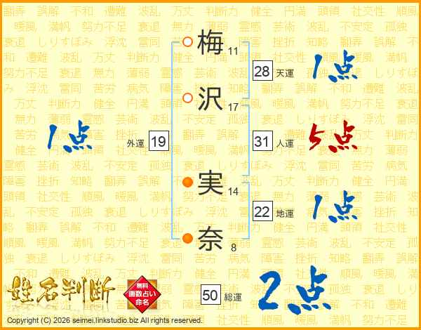 梅(11画)沢(17画) 実(14画)奈(8画)
