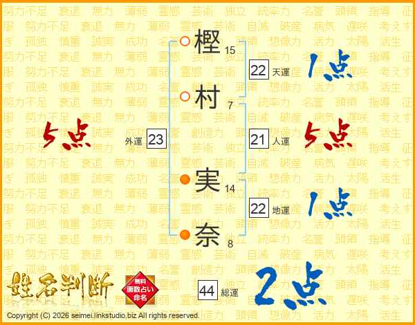 樫(15画)村(7画) 実(14画)奈(8画)