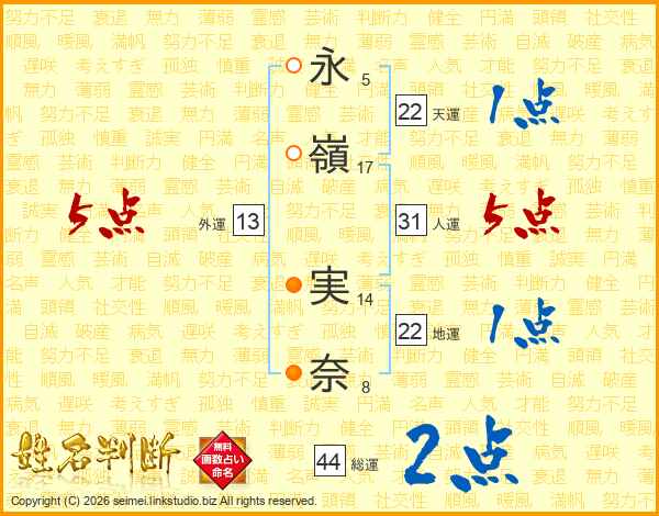 永(5画)嶺(17画) 実(14画)奈(8画)