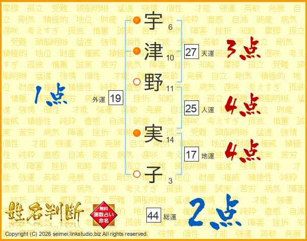 宇(6画)津(10画)野(11画) 実(14画)子(3画)