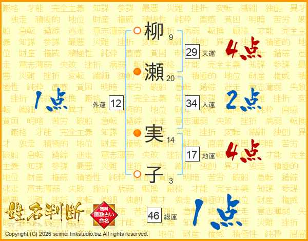 柳(9画)瀬(20画) 実(14画)子(3画)