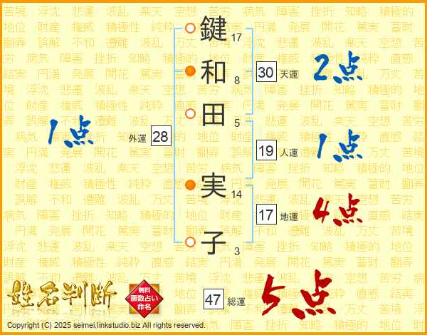 鍵(17画)和(8画)田(5画) 実(14画)子(3画)