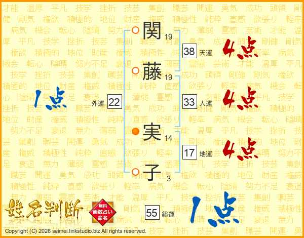 生活面を象徴する運勢です。外部から受ける影響力を表し、結婚運、家庭運や職場、環境への順応性を表します。総運から人運を引いた画数。姓や名が1文字の場合を除く。
