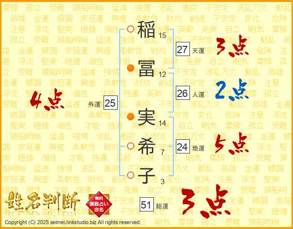 稲(15画)冨(12画) 実(14画)希(7画)子(3画)