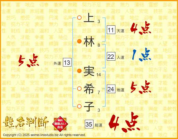 上(3画)林(8画) 実(14画)希(7画)子(3画)