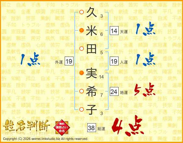 久(3画)米(6画)田(5画) 実(14画)希(7画)子(3画)