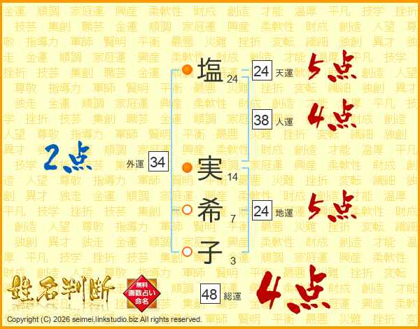 塩(24画) 実(14画)希(7画)子(3画)