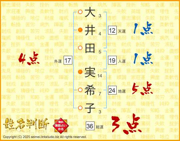 大(3画)井(4画)田(5画) 実(14画)希(7画)子(3画)