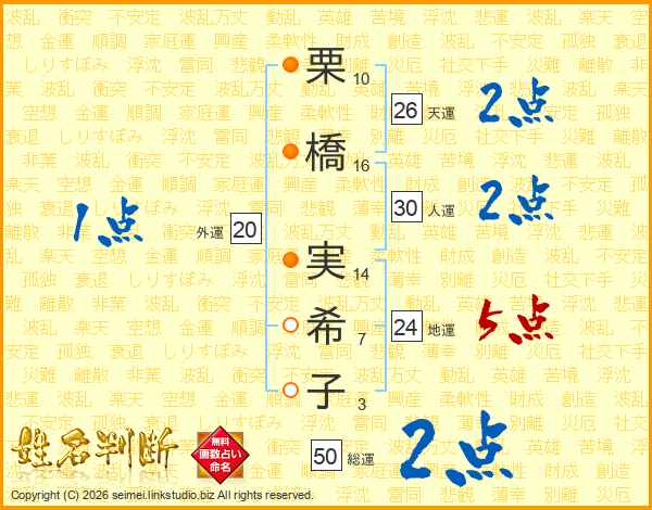 栗(10画)橋(16画) 実(14画)希(7画)子(3画)