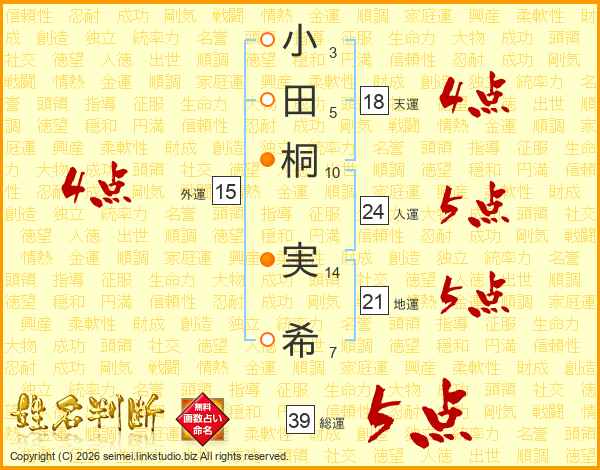 小田桐実希さんの総運は39画の5点!