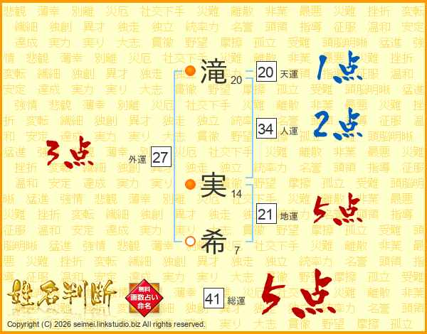 滝(20画) 実(14画)希(7画)