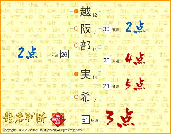 越(12画)阪(7画)部(11画) 実(14画)希(7画)