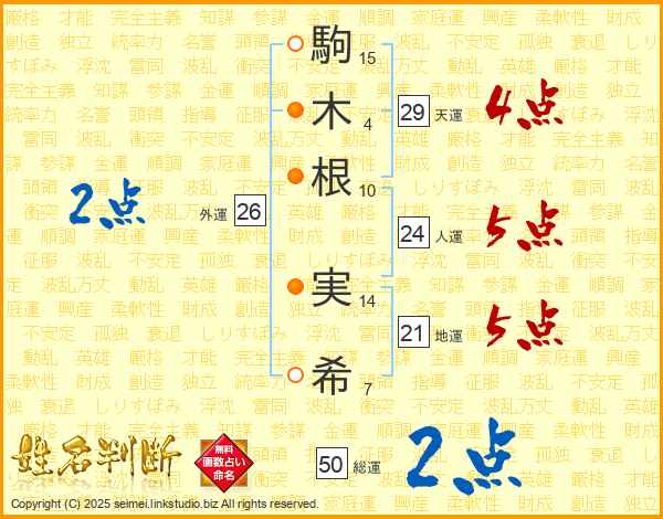駒(15画)木(4画)根(10画) 実(14画)希(7画)