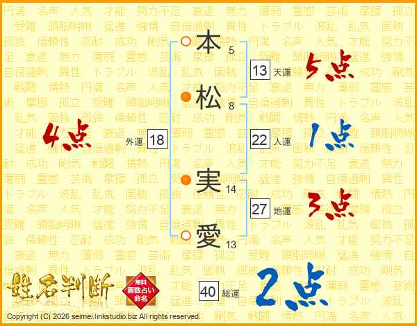 本(5画)松(8画) 実(14画)愛(13画)