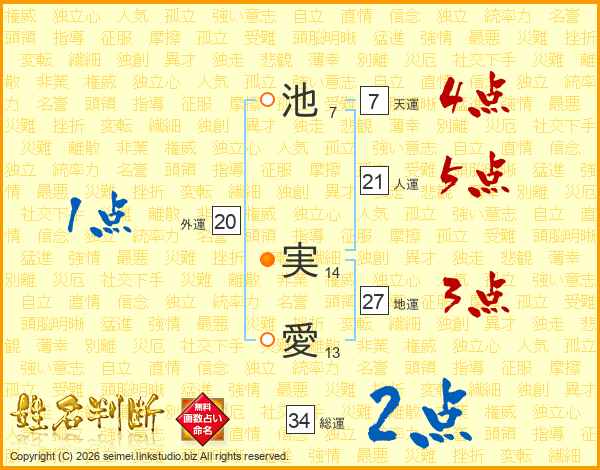 池(7画) 実(14画)愛(13画)