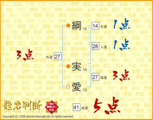 綱実愛さんの総運は41画の5点!