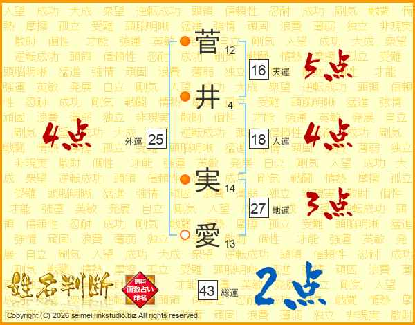 菅(12画)井(4画) 実(14画)愛(13画)